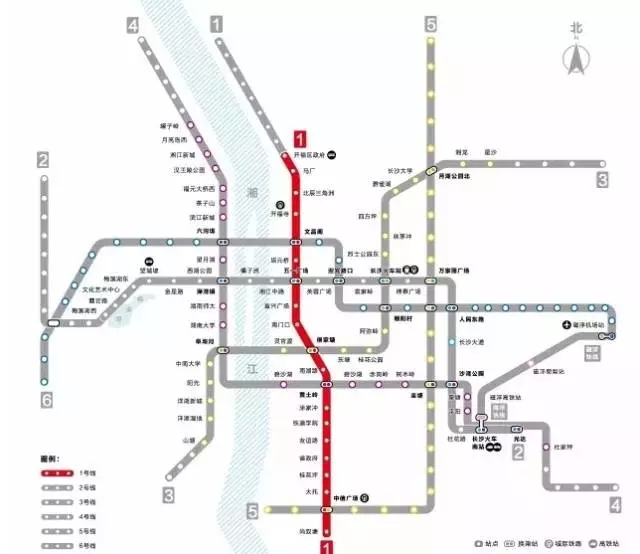 1号线:贯穿城市南北主轴,起于开福区政府站,止于尚双塘站,与2号线一期工程形成长沙轨道线网的“十字”核心骨架网络。