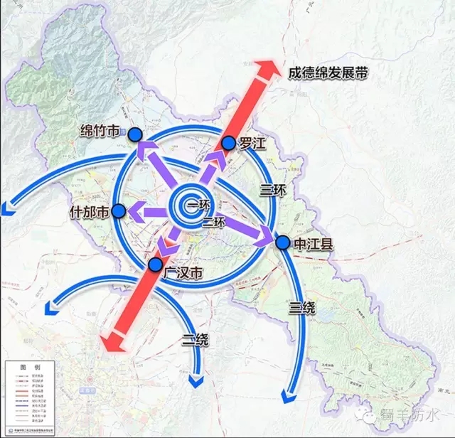 “五环”即德阳现有的一环路和规划建设的二环路、三环路,与成都建成的二绕、正在建设的三绕共同形成德阳交通的五环;“多轴”则是成都北部与德阳中心城区所有主干道、德阳各市县与成都接壤区县之间连接通道、德阳中心城区到各县市主轴形成的多轴。