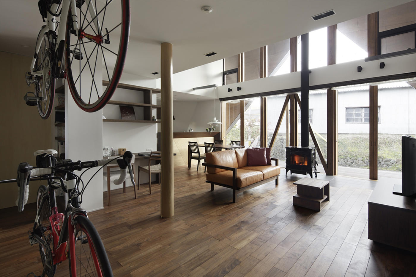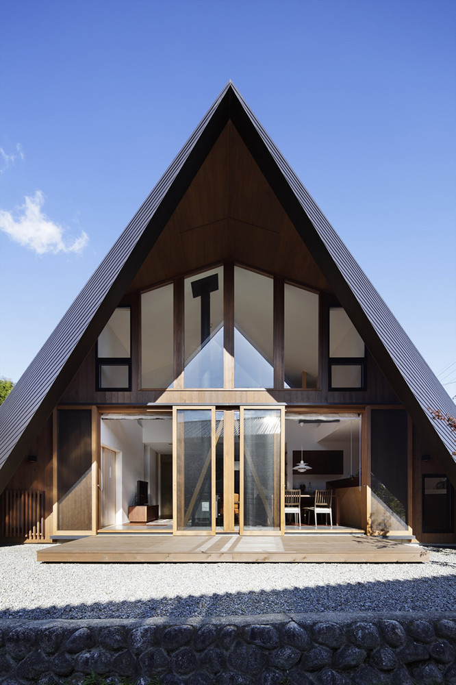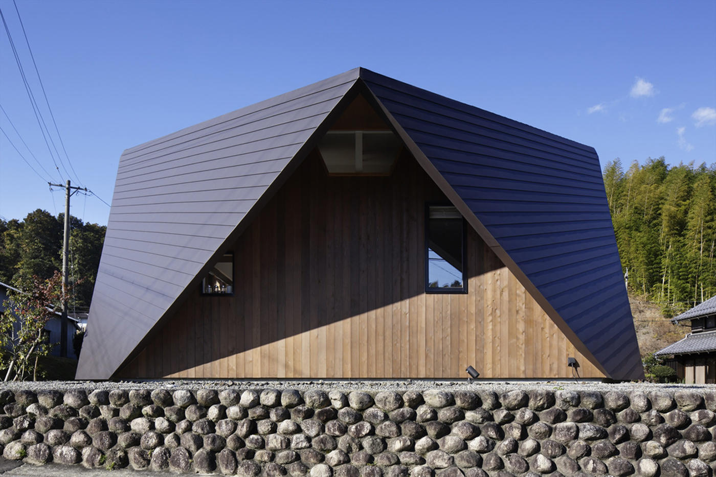 斜屋顶与地面相交,外形上加强了自身的存在感,同时也能抵抗强风和地震,遮风挡雨,也成为结构的一部分。
