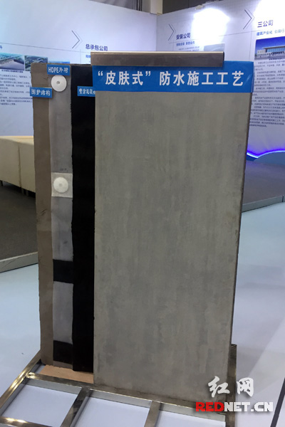 “这是我们的‘皮肤式’防水施工工艺模型,这项工艺运用到地铁车站建设中,防水效果优于传统工艺。”现场工作人员介绍,该工艺通过喷涂速凝橡胶沥青防水涂料成膜后,与混凝土粘接力强,可有效避免渗水,并具有良好的阻水能力和钉孔自密性,长时间内对细小破坏具有自愈性,形成真正的“皮肤式”防水。目前,这项工艺已经成功运用到长沙地铁4号线汉王陵公园站施工过程中。
