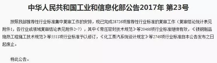 6月2日,工信部发布2017年第23号公告。公告称按照工信部推荐性行业标准集中复审工作的安排,现已完成28726项推荐性行业标准的复审工作,20466项行业标准继续有效,5511项行业标准予以修订,2749项行业标准自本公告发布之日起废止。在废止的2749项行业标准中,含沥青柔性复合胎防水卷材、氯化聚乙烯-橡胶共混防水卷材等7项防水材料标准。详见下表: